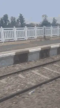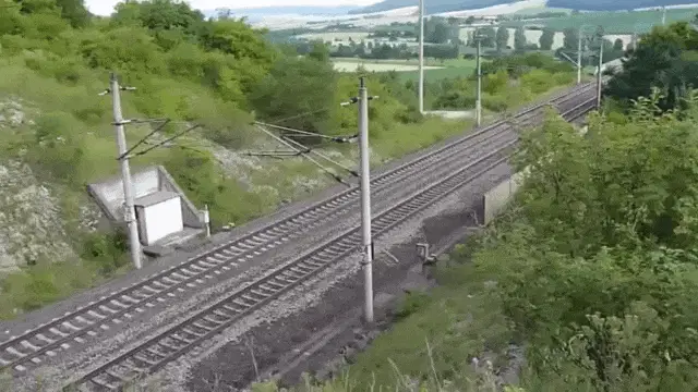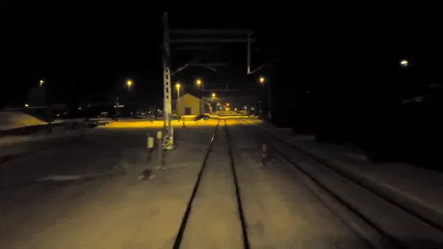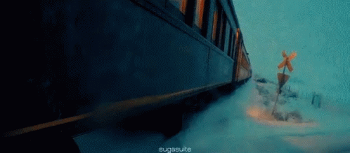 A dark train car travels rapidly through a snow-covered landscape, kicking up snow as it moves.
