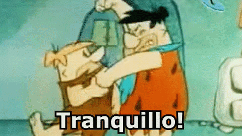 Fred Flintstone holds Barney Rubble, with the caption 'Tranquillo!' indicating a need for calm.