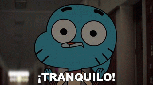 Gumball from The Amazing World of Gumball is visibly angry, shouting 'Calm down!' in a school hallway.