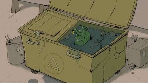 An animated dumpster filled with trash, prominently featuring a green gas can labeled 'GAS' inside.