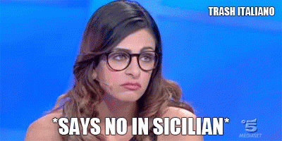 A woman from Trash Italiano, wearing glasses, expresses disapproval by saying no in Sicilian.