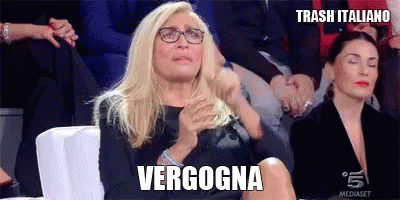 Mara Venier, wearing glasses, reacts with an expression of shame, exclaiming 'Vergogna!' in a dramatic moment.