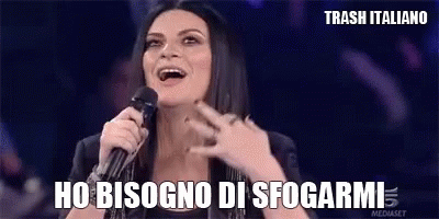 Laura Pausini on stage with a microphone, saying 'Ho bisogno di sfogarmi' (I need to vent) in a clip from Trash Italiano Amici.