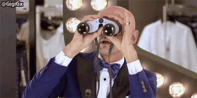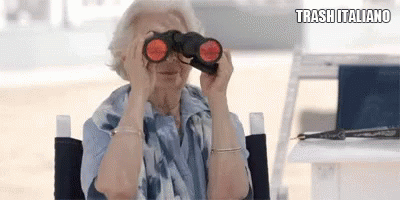 Clelia Donofrio, an elderly woman, looks through binoculars in a scene from Trash Italiano Bake Off.