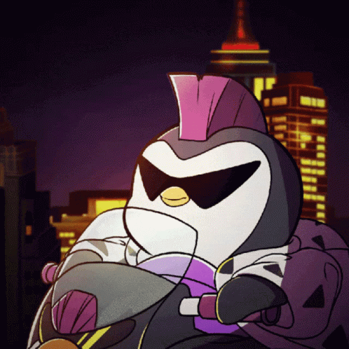 A cool cartoon Pudgy Penguin wearing sunglasses and a mohawk rides a motorcycle through a city at night.