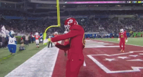 Travis Kelce of the Kansas City Chiefs celebrates on the football field, pumping his fist and interacting with the crowd.