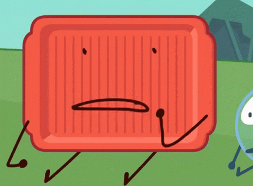A red cartoon tray character with a face and limbs, from the Object Show 'Onehfj'.