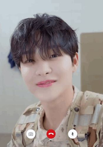 Park Jihoon from Treasure on a video call, smiling while wearing a military-style uniform.