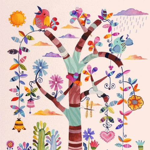 A vibrant folk art painting featuring a whimsical tree adorned with colorful flowers, birds, and decorative elements under a sunny sky.