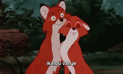 Two animated foxes share a loving embrace, with the Dutch phrase 'Ik hou van je' (I love you) displayed.