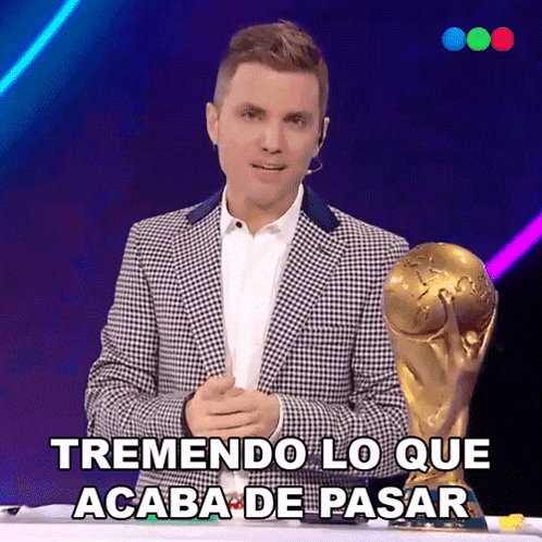 Santiago Del Moro reacts dramatically, holding a trophy, exclaiming "Tremendous what just happened."