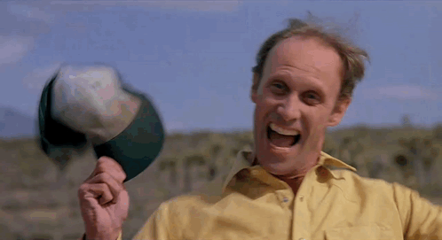 Kevin Bacon as Val McKee in Tremors, enthusiastically yelling 'Alright!' while holding a cap.