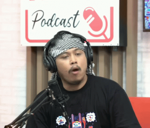 Tretan Muslim from Majelis Lucu on a podcast, reacting with the Indonesian slang 'Norak!'