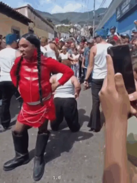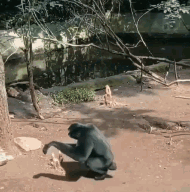 A black monkey interacts with a small, light-colored animal, possibly a porcupine or wild pig, in an outdoor setting.