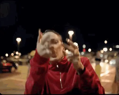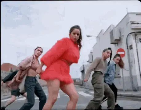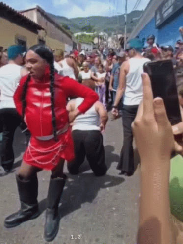 Treyreloaded performs a lively Bizcochito dance in a red outfit, channeling Rosalia's iconic style.