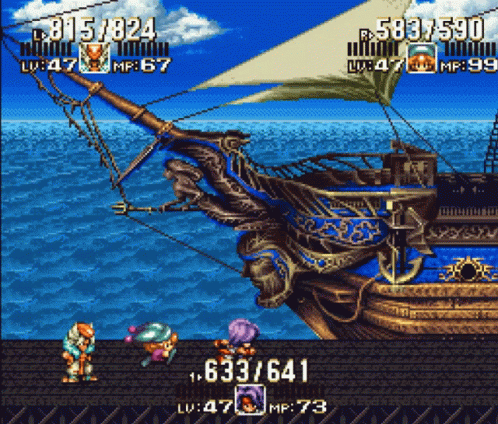 Classic SNES RPG Trials of Mana (Seiken Densetsu 3) gameplay featuring a ship battle scene on the open sea.