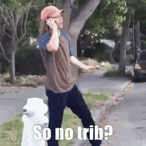 A man on the phone asks "So no trib?" and reacts with a disappointed gesture, turning away.