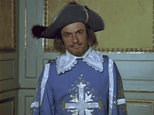 Three musketeers in historical costumes bow respectfully in an ornate room, capturing a moment of formal greeting.