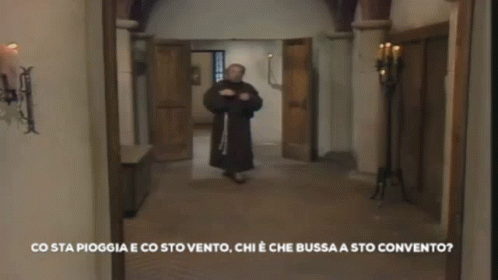 A monk in a convent hallway asks, 'With this rain and this wind, who is knocking at this convent?'