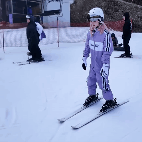 a person on skis wearing a purple outfit that says runway on the front