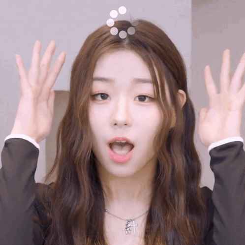 K-pop idol Chaeyeon from Triples makes a funny face with a 'loading' animation appearing above her head.