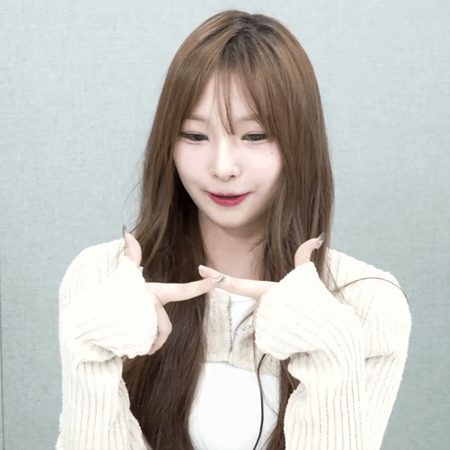 Triples' Hayeon makes cute finger heart gestures, smiling brightly in a white sweater.