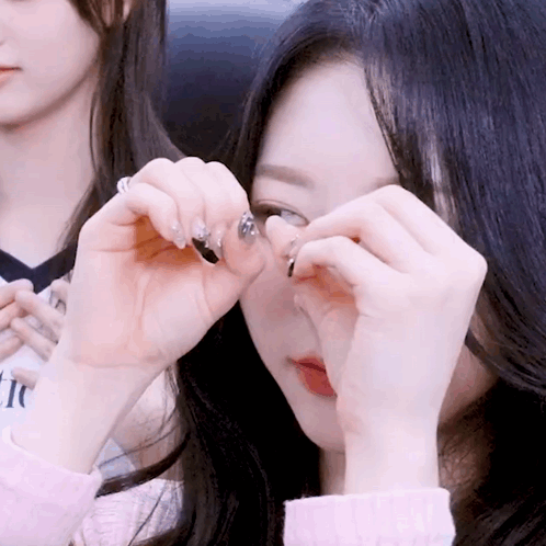 a close up of a woman covering her eyes with her hands and a ring on her finger