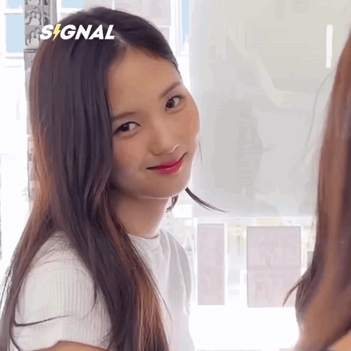 Triples member Jiwoo with long hair, wearing a white shirt, gives a charming smirk to the camera with a 'SIGNAL' logo.