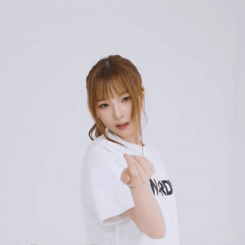 Hayeon from Triples S19 poses in a white 'NERDY' t-shirt, showcasing her elegant and cool style.