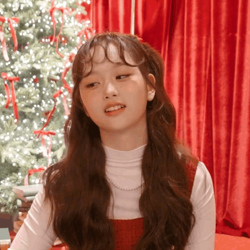a girl with long brown hair is smiling in front of a red curtain and christmas tree