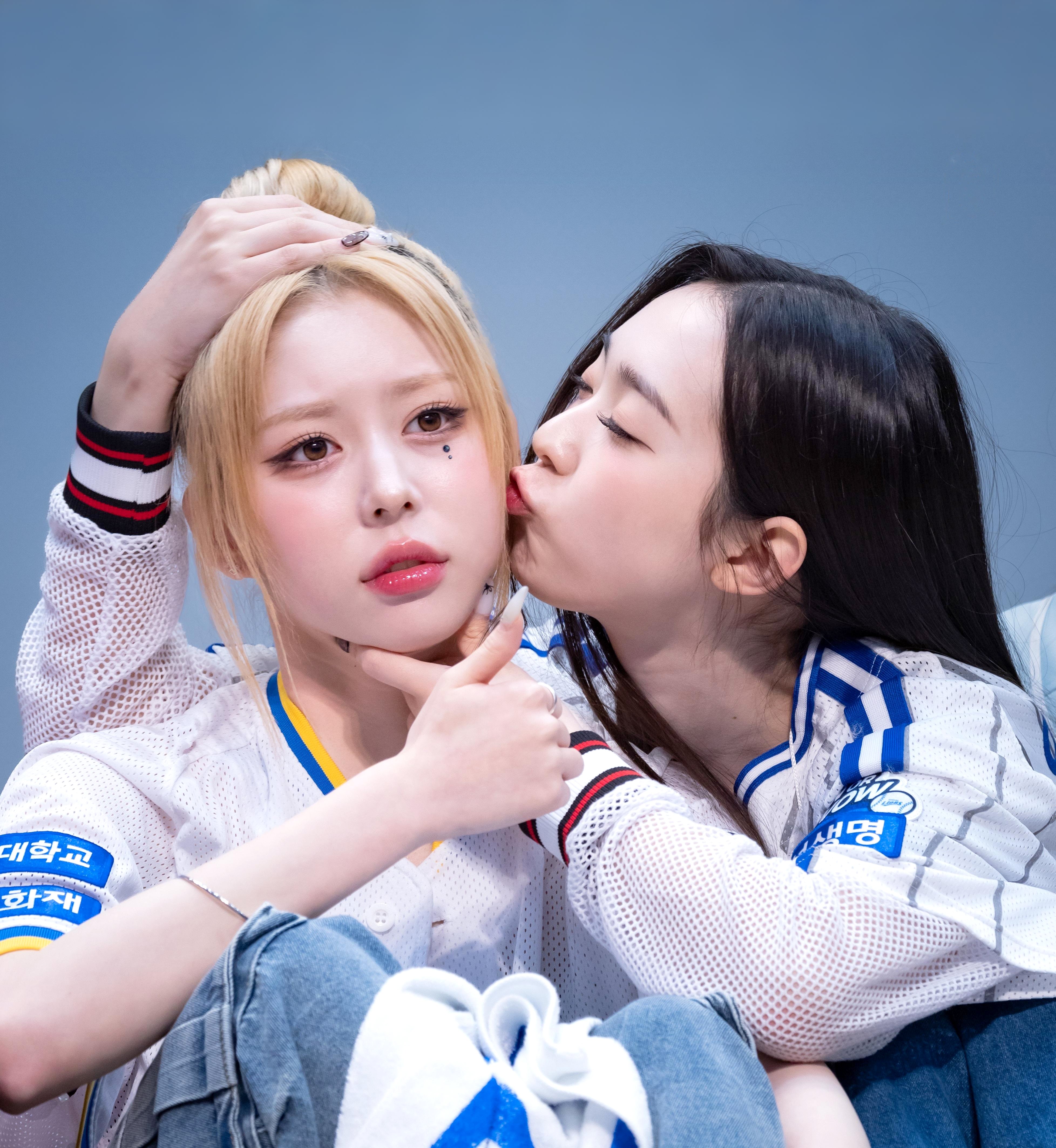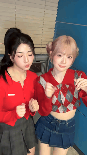 two girls are standing next to each other in front of a window .