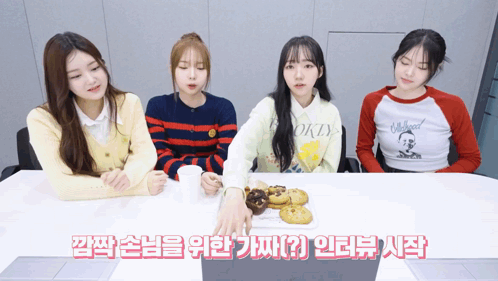 tripleS members Seoyeon, Shion, Hayeon, Joobin, and Lynn are surprised by a guest's entrance during a fake interview.