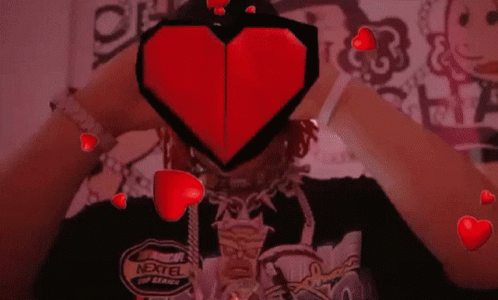 Trippie Reds makes a heart shape with his hands, surrounded by floating red hearts and glowing eyes.