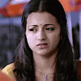Trisha looks away with a sad expression, her face showing distress and a bindi on her forehead.