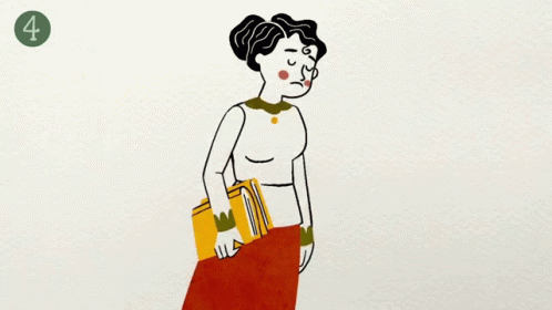 Cartoon drawing of a sad woman with dark hair, holding a yellow book, looking downcast.