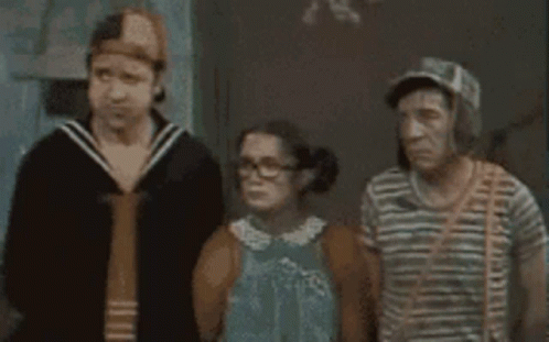 El Chavo, La Chilindrina, and Quico from El Chavo del 8 appear dejected, looking down in a moment of sadness.