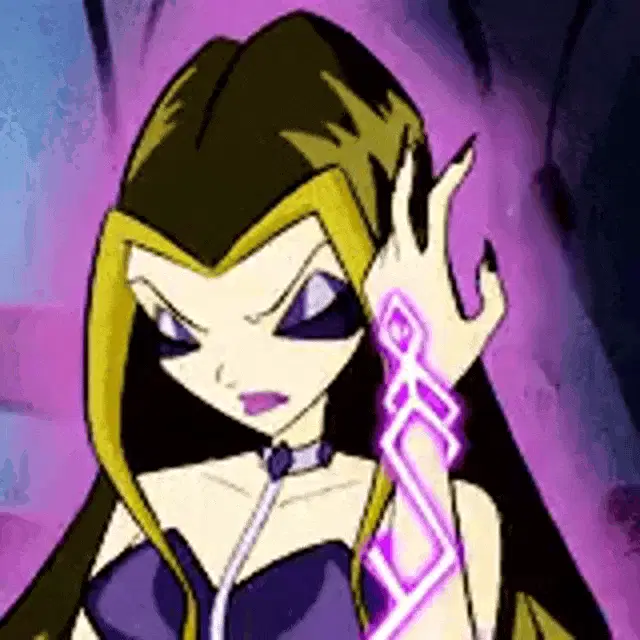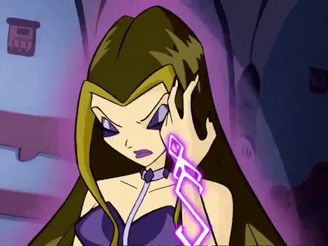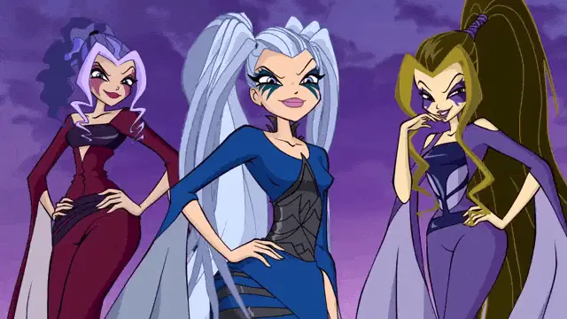 Winx Club fairies, likely Bloom and Stella, confront Trix magic in a dark, mystical corridor.