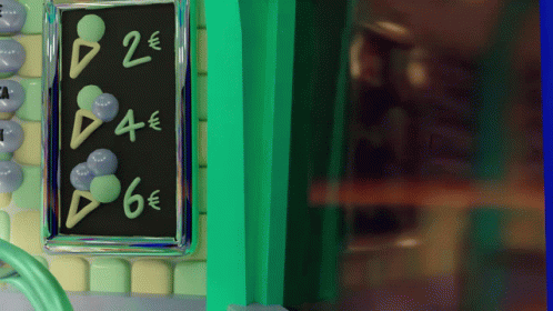 A finger selects 'Calme Ibiscus' from an ice cream menu displaying prices and flavors like 'Colère Pistache'.