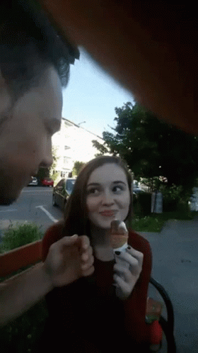 A man pretends to kiss a woman but instead bites her ice cream cone, surprising her in a funny troll prank.