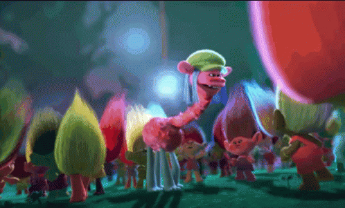 A group of colorful Trolls characters dancing and celebrating in a vibrant, magical forest setting.