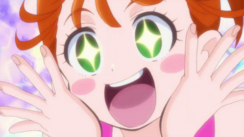 Natsuumi Manatsu from Tropical Rouge Precure, an anime girl with orange hair and sparkling green eyes, is super excited.