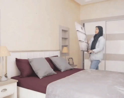 IMANEBITI arranging a picture frame in a bedroom, adding a decorative touch to the home.