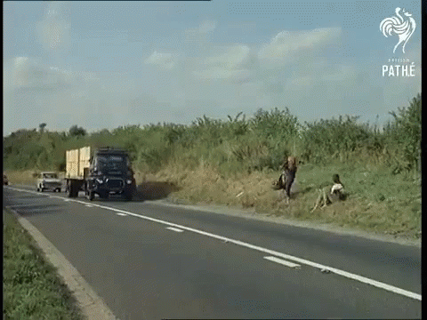 Hitchhikers on a roadside get a ride in a classic lorry, capturing the spirit of the good old days.
