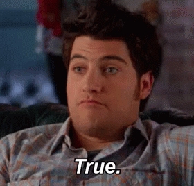 A man from Happy Endings, wearing a plaid shirt, reacts by saying "True."