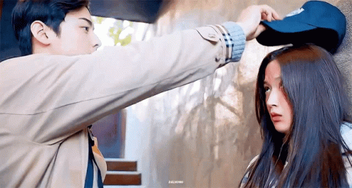 Cha Eunwoo's character, Lee Suho, gently places a baseball cap on Jugyeong's head in a scene from True Beauty.