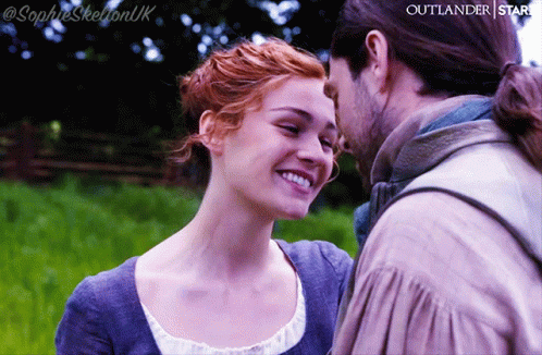 Roger Mac (Richard Rankin) and Brianna (Sophie Skelton) share a tender moment in Outlander.