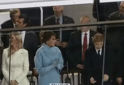 Melania Trump in a blue coat interacting with Barron Trump at a formal event, captured live.