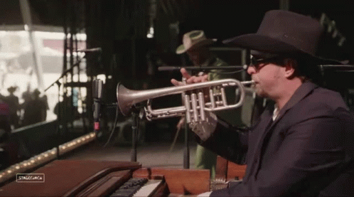 Charley Crockett performs live, playing the trumpet and organ on stage at the Stagecoach Festival.