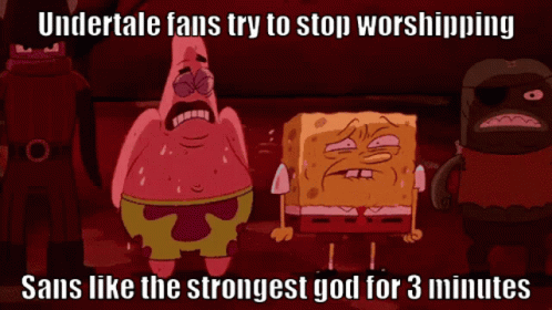 Undertale fans, represented by Spongebob and Patrick, struggle to stop worshipping Sans for 3 minutes in this meme.