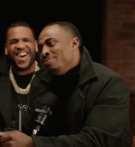 Richie Loc attempts to stifle his laughter while another man laughs heartily during a podcast.